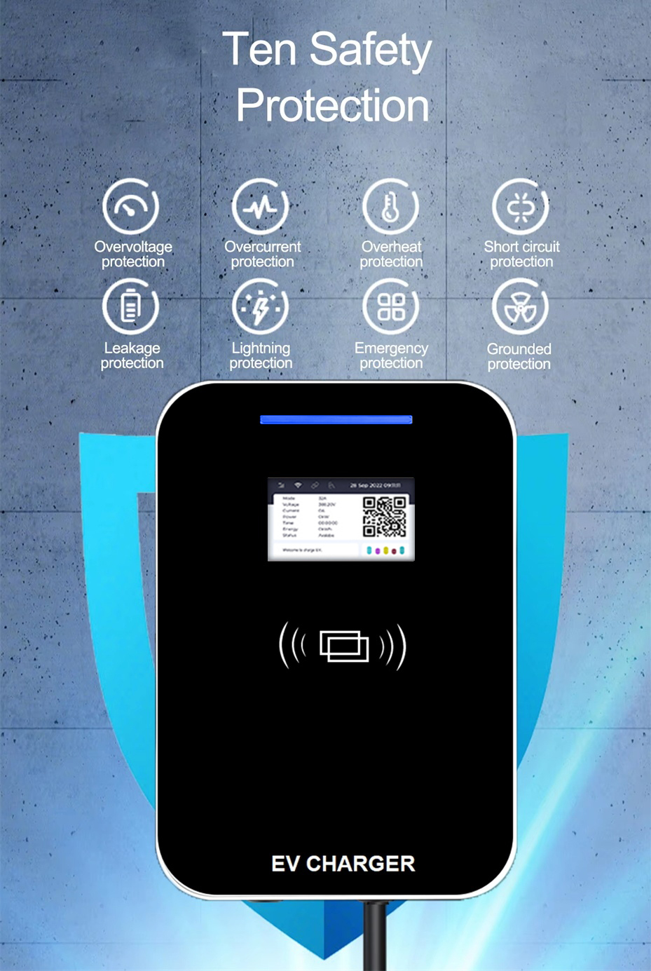Stay seamlessly connected via Wi-Fi or Bluetooth for remote management and real-time monitoring. This EV home charger boasts a sleek, compact design that blends modern aesthetics with functional efficiency. Its Power Boost technology optimizes charging infrastructure, reducing charging times for enhanced convenience. Integrated LED indicators and 4.3inch screen provide clear visual feedback on charging status, while built-in DC leakage protection ensures robust safety during operation.