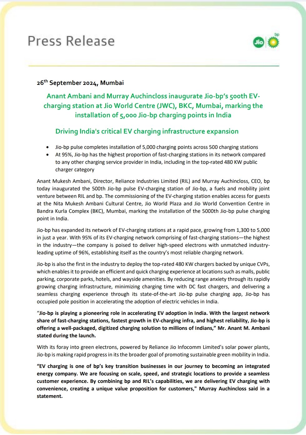 In 2020, BP invested $1 billion (around €895 million) for its minority interest in RBML and has committed over $12 billion (approximately €11 billion) to the energy sector in India to date. "India is undeniably the fastest-growing energy nation globally, and we are fortunate to have a strong partner like Reliance to advance with," said BP CEO Murray Auchincloss during the inauguration of the 500th station and the 5,000th charging point.