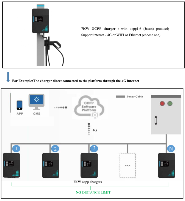 The 7kw ocpp charger can be connected to a charging network directly. The charger have OCPP protocol board inside the body. The charger operation and status is monitored and controlled by existing backend or central management system.